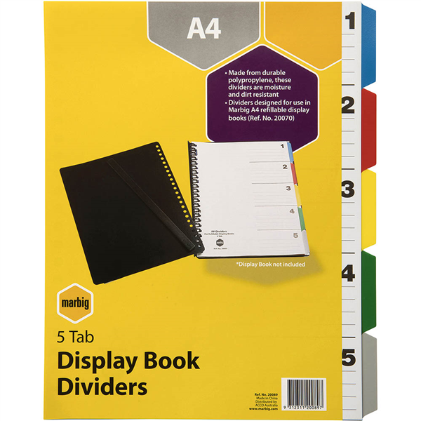 MARBIG DISPLAY BOOKS DIVIDERS 1-5 TAB A4 ASSORTED