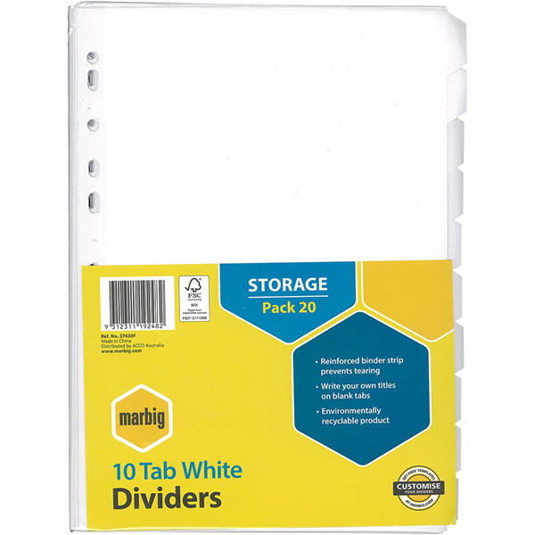 Marbig dividers are made from reinforced manilla board with plastic reinforced tabs and binder strips for durability and longer life