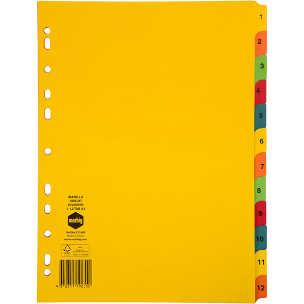 MARBIG DIVIDER MANILLA 12-TAB A4 BRIGHT ASSORTED