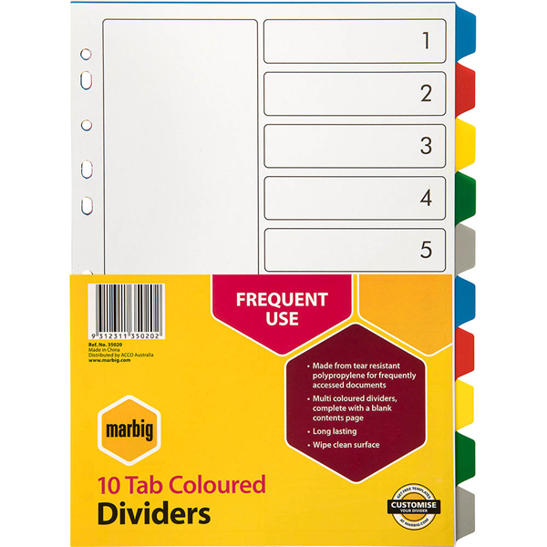Marbig multicoloured divider is ideal for regular use as the strong polypropylene allows files to be frequently accessed whilst maintaining appearance and they wont break or tear with constant use