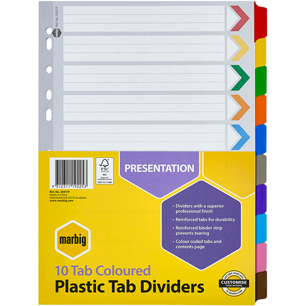 Marbig dividers are made from reinforced manilla board with plastic reinforced tabs and binder strips for durability and longer life