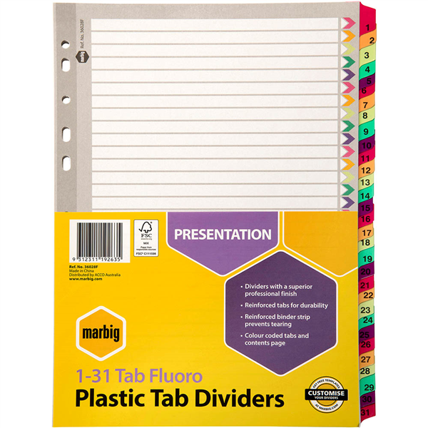 Marbig dividers are made from reinforced manilla board with plastic reinforced tabs and binder strips for durability and longer life