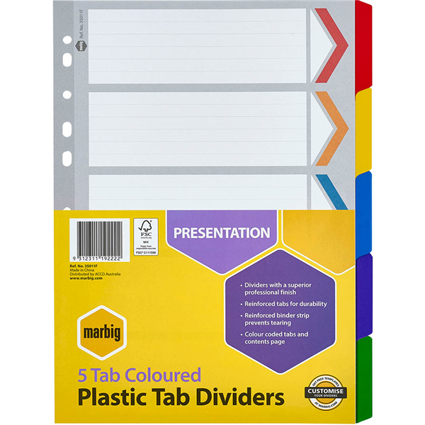 Marbig dividers are made from reinforced manilla board with plastic reinforced tabs and binder strips for durability and longer life