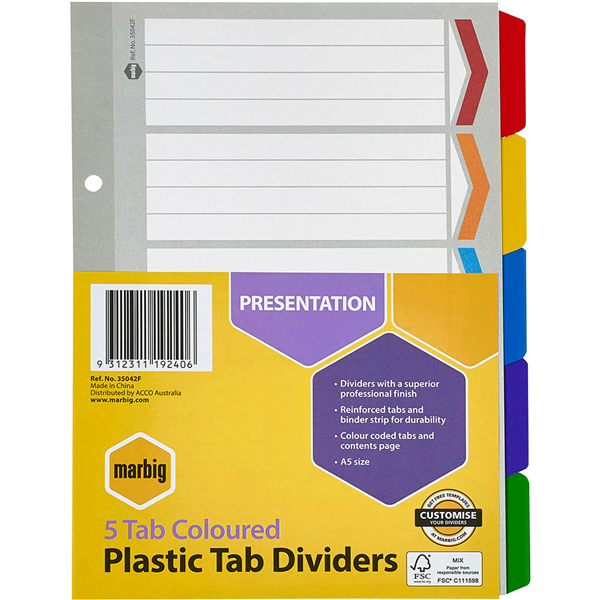 Marbig dividers are made from reinforced manilla board with plastic reinforced tabs and binder strips for durability and longer life