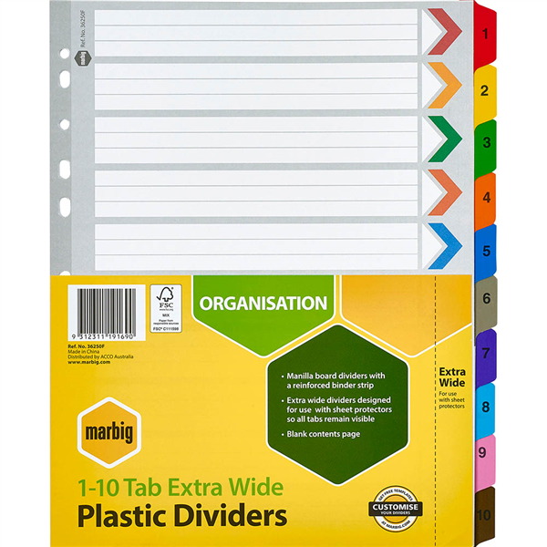 Marbig extra wide dividers are made from reinforced manilla board with plastic reinforced tabs and binder strips for durability and longer life