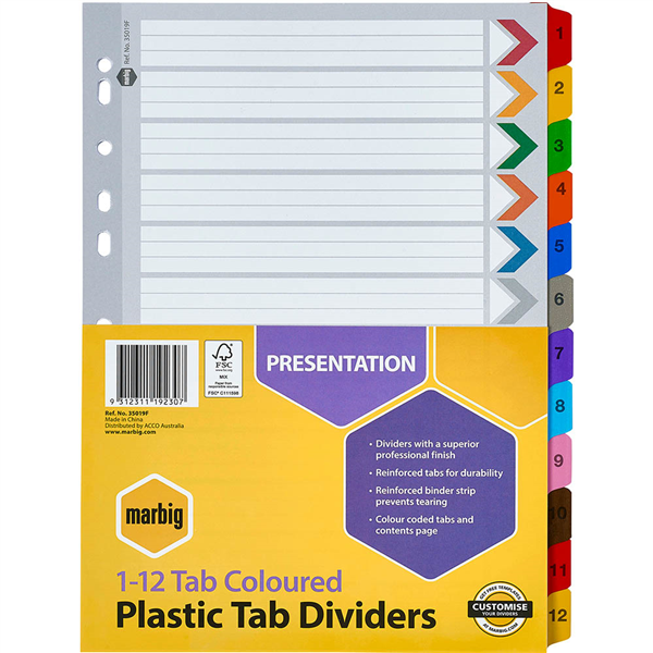 Marbig dividers are made from reinforced manilla board with plastic reinforced tabs and binder strips for durability and longer life