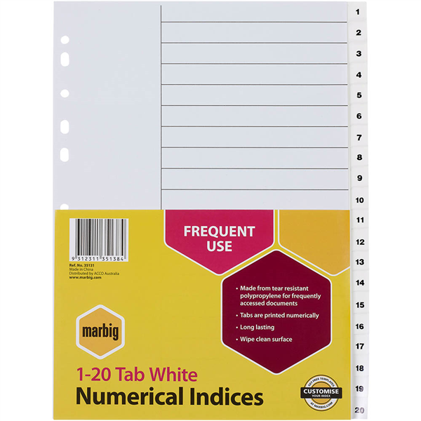 MARBIG INDEX DIVIDER NUMERICAL 1-20 TAB PP A4 WHITE