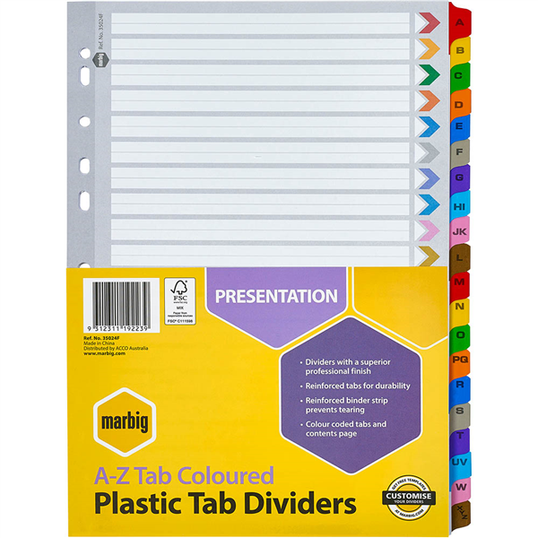 Marbig dividers are ideal for use in all binders and lever arch files. Available in a variety of tabs and colours