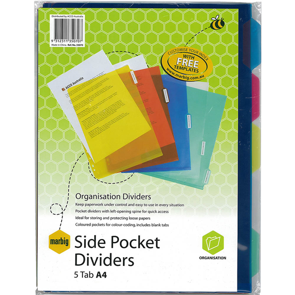 MARBIG SIDE POCKET DIVIDERS PP 5-TAB A4 ASSORTED
