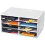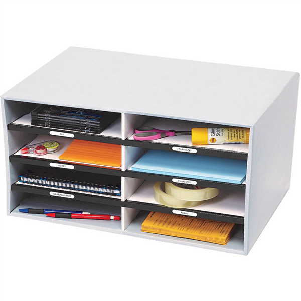 Eight handy compartments for file storage, shelving space or use as pigeon holes Organises mail, forms, catalogue sheets, or any letter sized literature Includes plastic clips and labels for setting up a desktop index system Made from durable laminate board