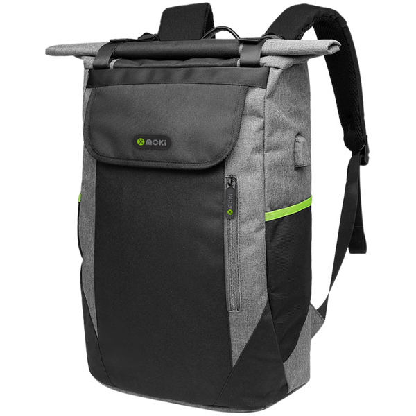 Keep your back cool and sweat free with a padded AirMesh back Inside the main compartment you will find 3 separate compartments and a strap - perfect for storing your laptop, notebook and accessories The Roll-Top Backpack also features a two handy compartments on the front, and two mesh compartments on either side - perfect for drink bottles The Moki Roll-Top Backpack also features a USB port on the side, with a USB cable extender on the inside Keep your power bank on the inside of the bag, while charging your phone on the outside - you can even store your phone in the front compartment to keep your phone charged when travelling