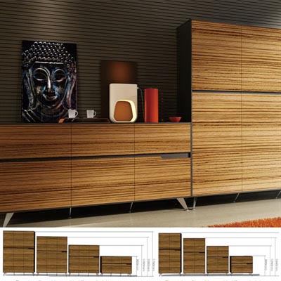 Lux Novara- Zebrano real wood veneer credenzas and cabinets in 6 and 4 drawer combinations. European one -touch soft close and open mechanisms. Recessed cummerbund handles provide clean lines and profiles. Matching alloy legs and black accents compliment the executive desk for superior European styling.