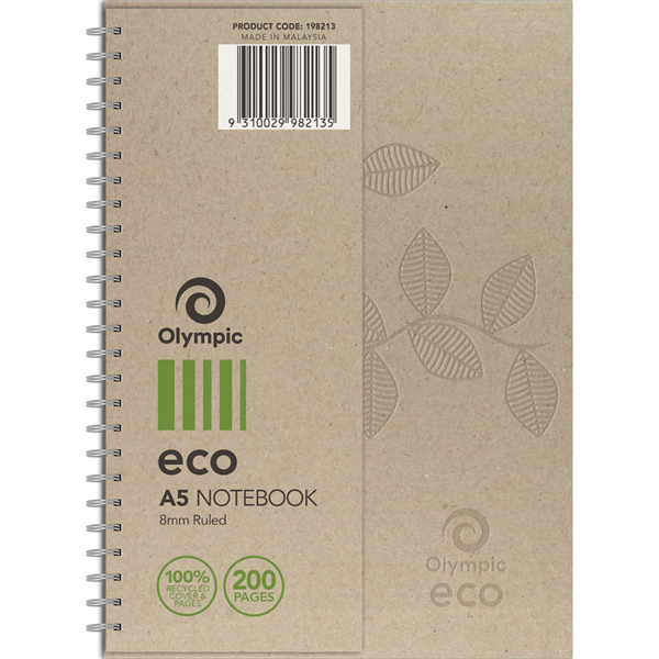 OLYMPIC ECO RECYCLED NOTEBOOK 8MM RULED 70GSM 200 PAGE A5 NATURAL