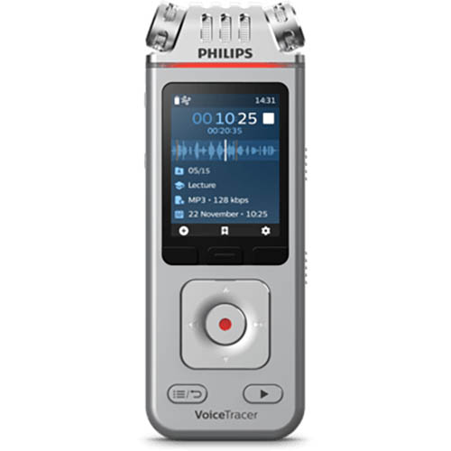 Capture lectures and distant speakers in outstanding sound quality thanks to the three specialized high-fidelity microphones. Record and control your recorder remotely using your smartphone app for even greater flexibility. Easily share your files with the world via the app Several key components are needed to record sound as naturally as possible in studio-like audio quality, high signal-to-noise ratio, highly dynamic microphones to capture soft tones as well as loud drums, a high-quality microphone suspension to avoid pickup of grip noise, a strong left and right channel separation for human ear live-like effect Capture your recordings in stereo MP3 or PCM format. The popular MP3 file format allows you to play back your files virtually anywhere and simply share them with others. The PCM (WAV) format allows stereo recording of lossless, uncompressed sound in CD-like audio quality Capture and store up to 88 days of continuous recording with the 8 GB of internal memory. A microSD memory card slot for up to 32 GB of additional memory guarantees virtually unlimited recording capacity The high-capacity Li-ion polymer battery can be easily charged through a standard USB C jack. This guarantees extended battery life for extra-long recording up to 36 hours, ensuring that your recorder will always be ready to work when you are Control your audio recorder using your smartphone, even from a distance. The Philips VoiceTracer app makes recording events such as lectures much easier and more convenient. You can place your recorder in the front of the room near the speaker, take a seat at the back, and still control recording comfortably and without interrupting the lecture. The Philips VoiceTracer app can be downloaded for free from the Apple App Store or Google Play Store Transfer your recordings straight from your Philips VoiceTracer to your smartphone via Wi-Fi and instantly share them with friends and family using the convenient Philips VoiceTracer app. No need to attach the recorder to your PC using a cable anymore to transfer and share files The large color display offers sharp images, making it easier to see and read everything at first glance. The clear user interface supports seven languages and is optimized for easy, intuitive operation The Philips VoiceTracer comes with preset scenes which automatically adjust the recorder's audio settings depending on what you want to record, whether it is notes, audio for speech recognition, interviews, lectures, music or meetings The recorder requires no special installation Simply plug your recorder into your PC or Mac and play back your files or transfer them to your computer right away The integrated tripod thread allows mounting the recorder onto a tripod or camera to capture even clearer sound in an optimal and stable position Smart recording functions make it even easier to achieve stunning audio results. The pre-recording and timer functions make sure you don't miss a single bit. Voice-activated recording is a convenient feature for hands-free recording which pauses recording when you stop speaking and resumes automatically when you begin speaking again. Recordings can be edited by overwriting a part or adding a new recording at the end. Long recordings can be split automatically or manually into separate files for easier editing or sharing. Smart playback functions, such as bookmarks and filters, also make it easier and quicker to find the recording you are looking for