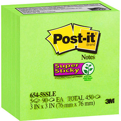POST-IT 654-5SSLE SUPER STICKY NOTES 76 X 76MM LIME PACK 5