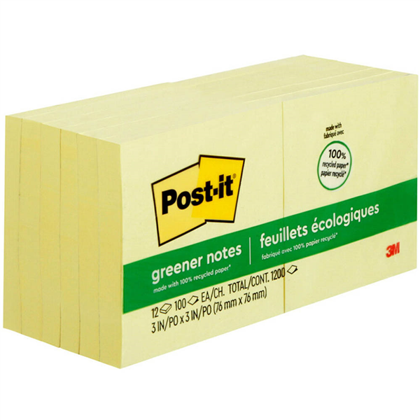 POST-IT 654-RP 100% RECYCLED GREENER NOTES 76 X 76MM YELLOW PACK 12