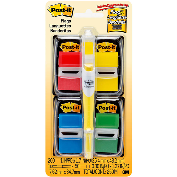 All Post-it Flag Value Packs contain a FREE product to try Assorted coloured flags are perfect for temporary flagging of documents, articles, books, and folders Easy to write on with most writing instruments, Post-it Flags stick securely and remove cleanly Great to bookmark reading material Stays where you place them and repositions as you need to For use as a stand-alone or in a sleek dispenser Make it simple to mark, flag or highlight important information Sticks securely, removes cleanly without damage Easy to Write on Colour code your organisation with multiples colours per pack! FREE Post-it Flag+ Pen