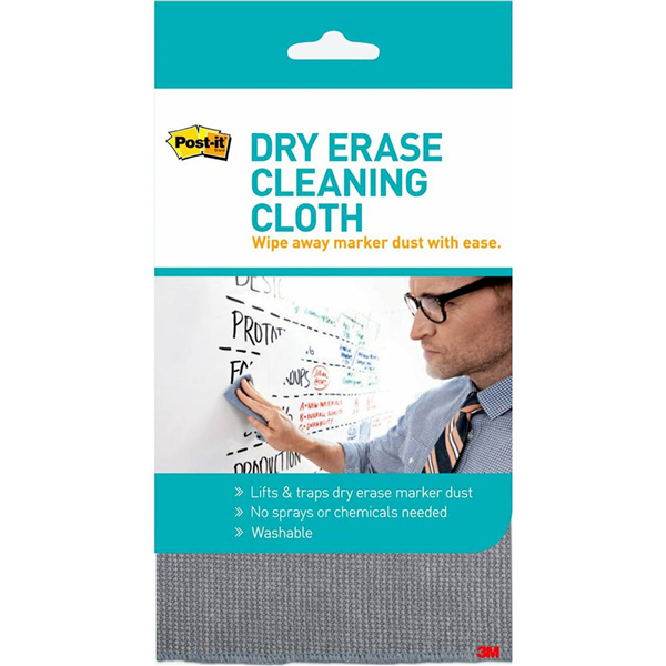 The Post-it Dry Erase Cleaning Cloth lifts and traps marker dust, is washable, and no sprays or chemicals are needed Lifts and traps dry erase marker dust No sprays or chemicals needed Ideal for everyday usage with Post-it Dry Erase Surfaces or whiteboards Wipe away marker dust with ease Washable