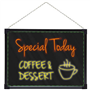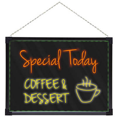 Eye-catching LED dry erase writing board Write your messages using Quartet LED Fluorescent markers Erasable with a soft cloth or LED eraser Bright LED colours with 17 flash modes Stylish black aluminium frame Wall mountable with chain included