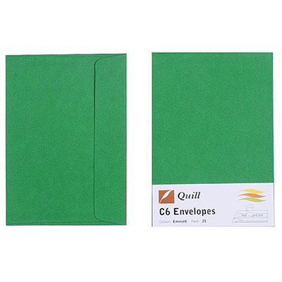 QUILL C6 COLOURED ENVELOPES PLAINFACE STRIP SEAL 80GSM 114 X 162MM EMERALD PACK 25