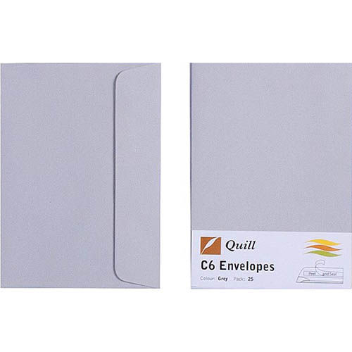 QUILL C6 COLOURED ENVELOPES PLAINFACE STRIP SEAL 80GSM 114 X 162MM GREY PACK 25