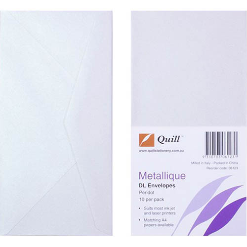 QUILL DL METALLIQUE ENVELOPES PLAINFACE STRIP SEAL 80GSM 110 X 220MM PERIDOT PACK 10