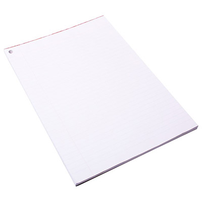 Quill Exam Pads feature sharp feint ruled 8mm lines on 60gsm paper, with one hole punched in top left corner and red ruled margin on left hand side