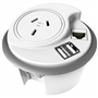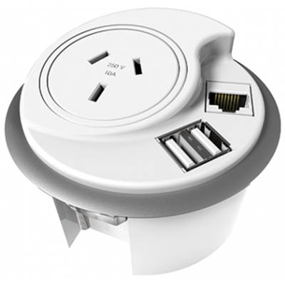 Fits into Standard 80mm Cable Port or Requires Additional 80mm Diameter Cut Out Links to Cable Basket, Adjoining Power Rail, Wall Starter or Power Pole Kit Data Jack Not Included Includes 3 Removable Covers For Different Configurations, 2 x 2.1 USB Charging Ports , 1 Auto Switched GPO And 1500mm Lead With 3 Pin Plug Backed by a 2 year warranty