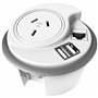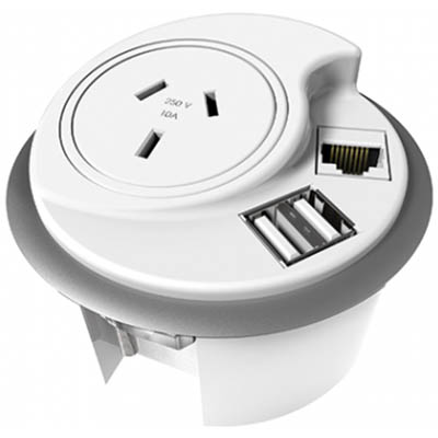 Plug in power at the desk top plus phone charging with the In desk module The device sits in an 80mm cable port Fits into Standard 80mm Cable Port or Requires Additional 80mm Diameter Cut Out Links to Cable Basket, Adjoining Power Rail, Wall Starter or Power Pole Kit Can plug into power point Includes 3 Removable Covers For Different Configurations, 2 x 2.1 USB Charging Ports, 1 Auto Switched GPO, 500mm Lead With Tag Connector And 3 Way Splitter Data Jack Not Included Backed by a 2 year warranty