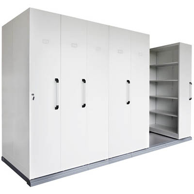 Rapidline mobile shelving is a space efficient method of bulk storage with an easy to level base and moveable, lockable shelving bays