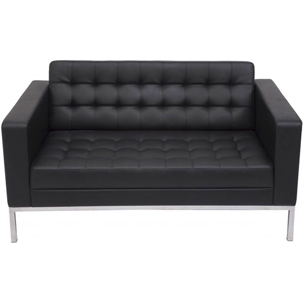 Elegant reception area two seat arm chair with button finish to black PU, easy clean upholstery Stainless steel underframe and legs Backed by a 3 year warranty Button finish SGS: EN12520 Certification