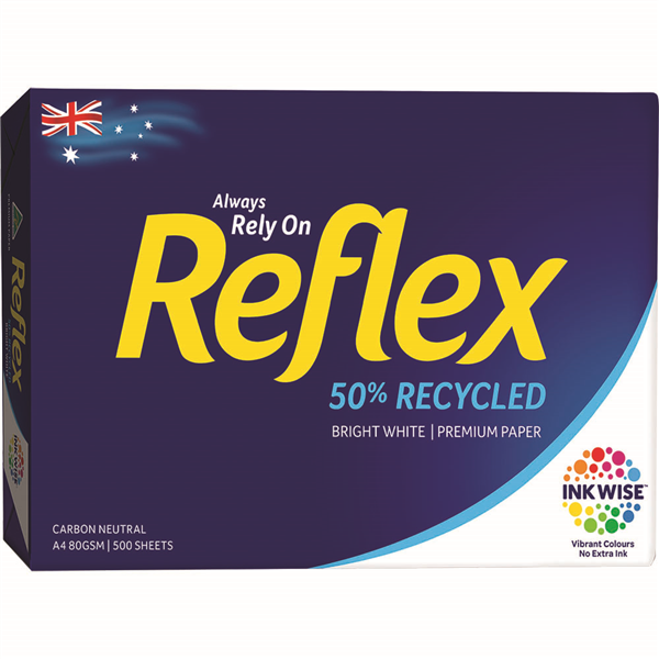 Reflex now delivers vibrant colours with no extra ink required, It is the superior paper choice for all your office and home needs More defined blacks and vibrant colours with no extra ink Suitable for everyday printing on both laser and inkjet printers Made from 50% recycled paper Quality double sided printing Proudly Australian Made PEFC Certified Certified to Climate Active Carbon Neutral And of course, no paper jams