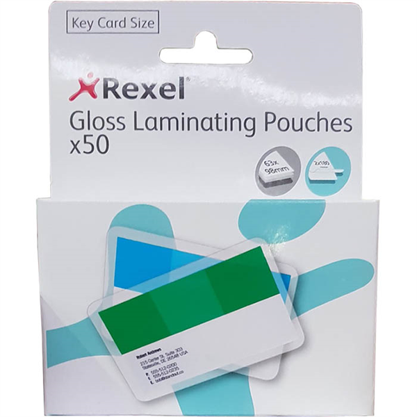 REXEL GLOSS LAMINATING POUCH 180 MICRON KEY CARD 63 X 98MM CLEAR PACK 50
