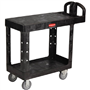 Two swivel castors for easy manoeuvrability Designed to transport bulky, oversized items or as a mobile work surface, the Rubbermaid Flat Shelf Cart is made of sturdy structural resin and has two fixed and two swivel non-marking castors Ergonomically designed push handle provides optimum hand placement and push height improving control and worker safety 227kg capacity, 113.5kg for each shelf Includes tool caddy