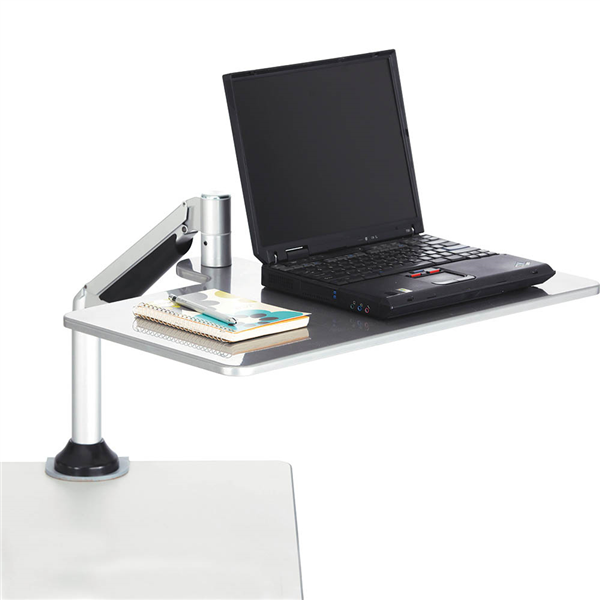 Adjustable arm mounts to desktop to raise laptop for standing use; Height adjustment and bend in arm promote better posture, optimal viewing comfort and help alleviate eye strain Easy lift operation; No knobs or levers needed to make adjustments Cable management concealed within adjustable arm for a neat, cord and clutter-free desktop Entire assembly swivels out of way to provide access to the desk surface when desired Heavy-duty, sturdy mount C-clamp is compatible with desk and table tops 3 inch or thinner Assembly required