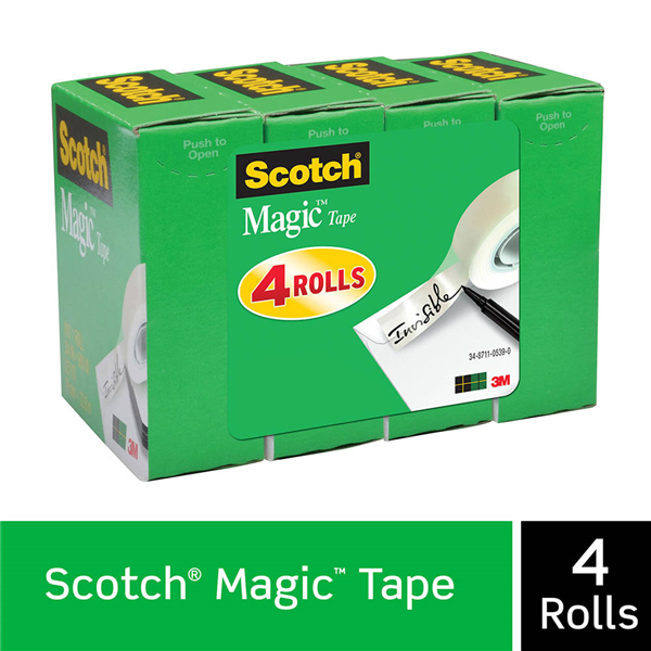 The Scotch Brand's famous matte-finish invisible tape uses unique 3M adhesive technology to bond tightly with paper and disappear without a trace Write on it with pencil, pen or marker.. every word is loud and clear Scotch Magic Tape is always ready for big ideas and everyday mends The original matte-finish, invisible tape Stands up to faxes, scanners and copiers Compatible with all of the Scotch Brand desktop dispensers for easy use Comes off the roll smoothly, cuts easily Preferred tape for offices, homes and schools Disappears on office paper Write on it with pen, pencil or marker Great for quick fixes, mounting or additions to your project Easy-to-apply design that doesn't dry out Photo safe