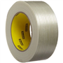 Synthetic rubber adhesive has good shear strength to fiber board surfaces for bundling, strapping and reinforcing applications Filament reinforced tape for demanding applications Abrasion and moisture resistant General industrial, food and beverage and automotive parts Box closing, palletizing, box reinforcing, and general bundling