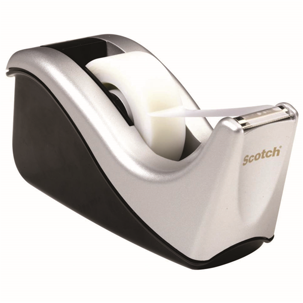 Heavily weighted for easy one handed dispensing Dispenses standard tapes on a 1 inch core up to 3/4 in x 36 yards The dispenser is silver and black in colour Deluxe two-tone silver/black desktop tape dispenser with weighted base Sleek wave design complements any decor Ideal for easy one-handed dispensing High-quality cutting blade lasts for years Non-skid base Weighted base for one-handed dispensing Holds 1 inch core tape Tape not included