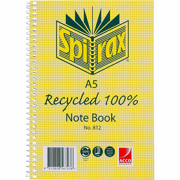 SPIRAX 812 NOTEBOOK 7MM RULED 70% RECYCLED CARDBOARD COVER SPIRAL BOUND A5 120 PAGE