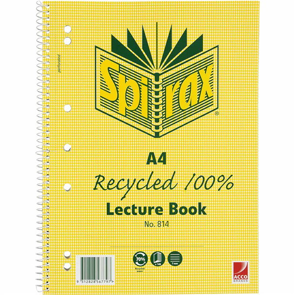 SPIRAX 814 LECTURE BOOK 7MM RULED 7 HOLE PUNCHED 70% RECYCLED SPIRAL BOUND A4 140 PAGE