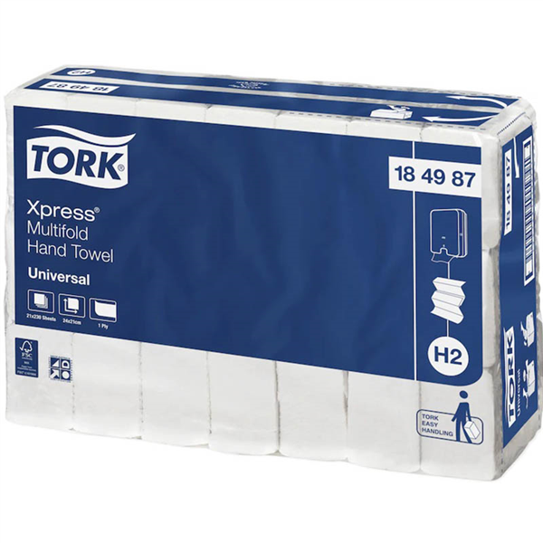 TORK 184987 H2 XPRESS UNIVERSAL SLIMLINE MULTIFOLD HAND TOWEL 1-PLY 210 X 240MM WHITE PACK 230 SHEET