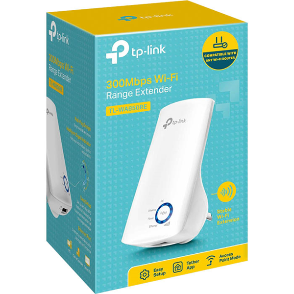 The devices miniature size and wall-mounted design make it easy to deploy and move flexibly. Once connected with an existing router, you can simply unplug and plug the Range Extender back in anywhere within wireless range of the existing router, without need to configure again With no new wires or cables, within range of their existing wireless network, users can easily extend wireless coverage at a push of the WPS button on their router followed by the Range Extender button on the TL-WA850RE or vice versa within 2 minutes The TL-WA850REs single Ethernet port allows the Extender to function as a wireless adapter to connect wired devices like Blu-ray players, gaming consoles, DVRs and Internet TVs. At the same time, the device can share the wireless network as well 5 signal lights show the strength of signal that TL-WA850RE receives from the existing router, which can help to find the right location to place the range extender 300Mbps wireless data rates ideal for video streaming, online gaming and internet calling Range Extender mode boosts wireless signal to previously unreachable or hard-to-wire areas flawlessly Miniature size and wall-mounted design make it easy to deploy and move flexibly Easily expand wireless coverage at a push of Range Extender button Ethernet port allows the Extender to function as a wireless adapter to connect wired devices Compatible with other 802.11n/g/b products Range Extender mode boosts wireless signal to previously unreachable or hard-to-wire areas flawlessly Miniature size and wall-mounted design make it easy to deploy and move flexibly Easily expand wireless coverage at a push of Range Extender button Ethernet port allows the Extender to function as a wireless adapter to connect wired devices