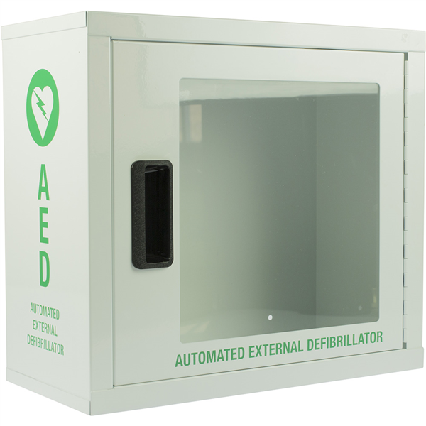 A wall-mounted cabinet for convenient placement of your defibrillator in your workplace Opening the door triggers the audible alarm to alert others that an event may be in progress Also helps keep your AED clean and dust free Alarmed