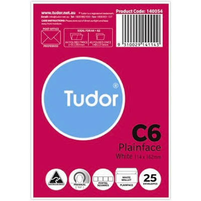 TUDOR C6 ENVELOPES WALLET PLAINFACE PRESS SEAL POST OFFICE SQUARES 80GSM 114 X 162MM WHITE PACK 25