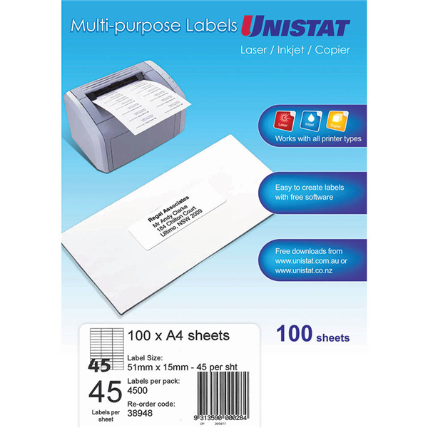 Use Unistat labels in your laser printer, inkjet printer or copier Select from a full range of mailing and parcel label sizes Ideal for addressing and other applications Suitable for laser printers, inkjet printers and copiers Self-adhesive ensures labels stay secure Natural white finish