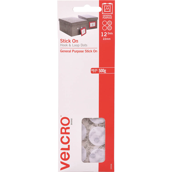 VELCRO BRAND? STICK-ON HOOK AND LOOP DOTS 22MM WHITE PACK 12