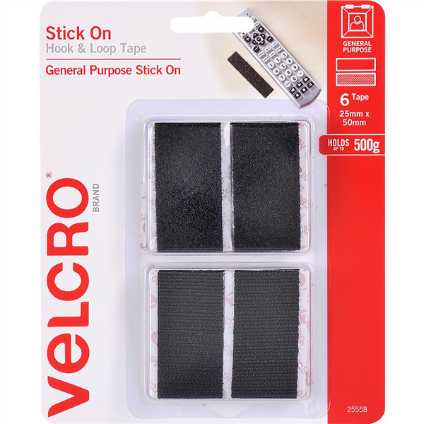 VELCRO BRAND? STICK-ON HOOK AND LOOP RECTANGLES 25 X 50MM BLACK PACK 6