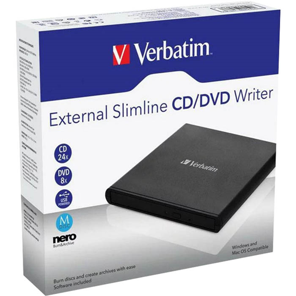 In addition to supporting all common CD and DVD formats, for both read and write functionality, the Verbatim External Slimline CD/DVD Writer is M-Disc ready - providing an archival solution with industry-leading disc lifetime expectancies - ideal for backing up sensitive data, as well as music and video libraries. The Verbatim Slimline CD/DVD Writer features Nero Burn & Archive software for seamless archiving, and reliable secure disc burns Read and write CD's and DVD's any time, any place - ideal notebook/ultrabook accessoryrn8X DVD Write Speed, 24X CD Write Speed Compact and lightweight - easily fits into laptop bag or backpack \ USB powered - no need to carry additional AC adapter Compatible with all common CD and DVD formats M-Disc Ready - perfect archival solution with industry-leading disc lifetime expectancies Features Nero Burn & Archive software 2-Year Limited Warranty Software compatible with Windows operating systems only This product requires a 3rd party application to playback video and audio files through all operating systems