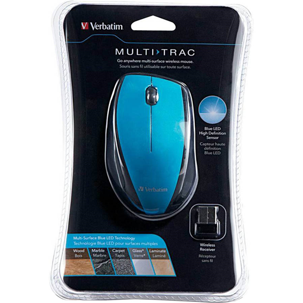 Navigate virtually anywhere with the Verbatim Multi-Trac Blue LED Optical Mouse. The comfort-grip shape provides ease of use while Blue LED technology allows users to point and click on more surfaces than other mice - from a glass table to the granite kitchen counter! The small nano receiver can be stored in the battery compartment, offering convenient storage and portability which makes this a great full-size go everywhere computer accessory