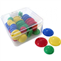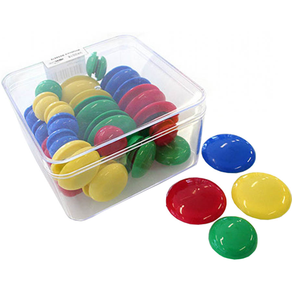 48 magnets in each of 4 assorted colours (red, blue, green, yellow) 3 assorted sizes: 20mm, 30mm and 40mm Note: Not suitable for use with magnetic glassboards